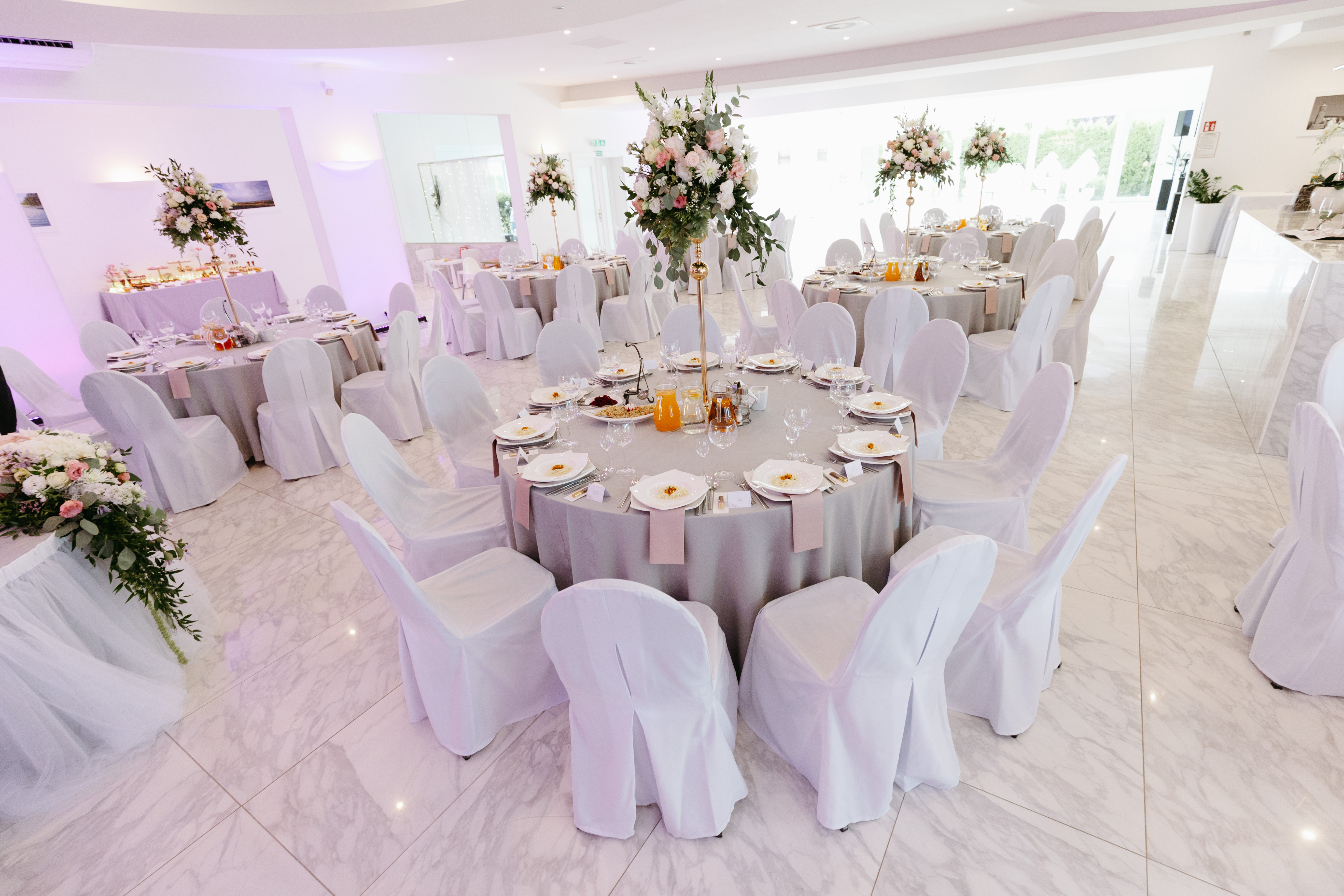 Sala Biała to największa i najbardziej reprezentacyjna przestrzeń w kompleksie Rueda. Jasna, elegancka i w pełni nowoczesna – została stworzona z myślą o organizacji wyjątkowych wydarzeń: wesel, komunii, jubileuszy, przyjęć okolicznościowych oraz firmowych gal.