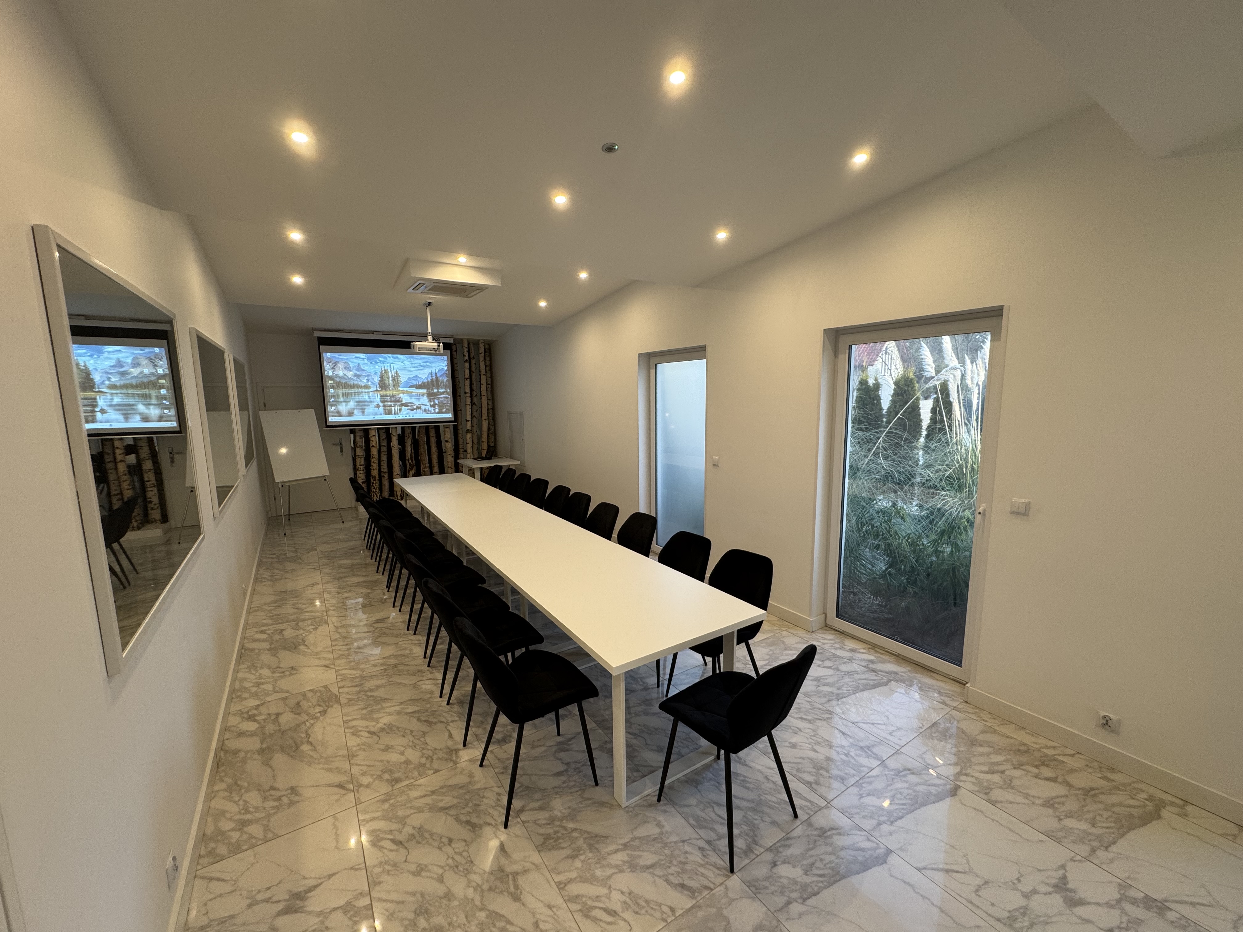 Komfortowa sala o powierzchni 45 m², przeznaczona dla grup do 25 osób. Sprawdza się podczas warsztatów, prezentacji i szkoleń w mniejszym gronie. Wyposażenie obejmuje projektor z ekranem, flipchart, klimatyzację, ściemniane oświetlenie oraz możliwość pełnego zaciemnienia. Dostępne jest również Wi-Fi.