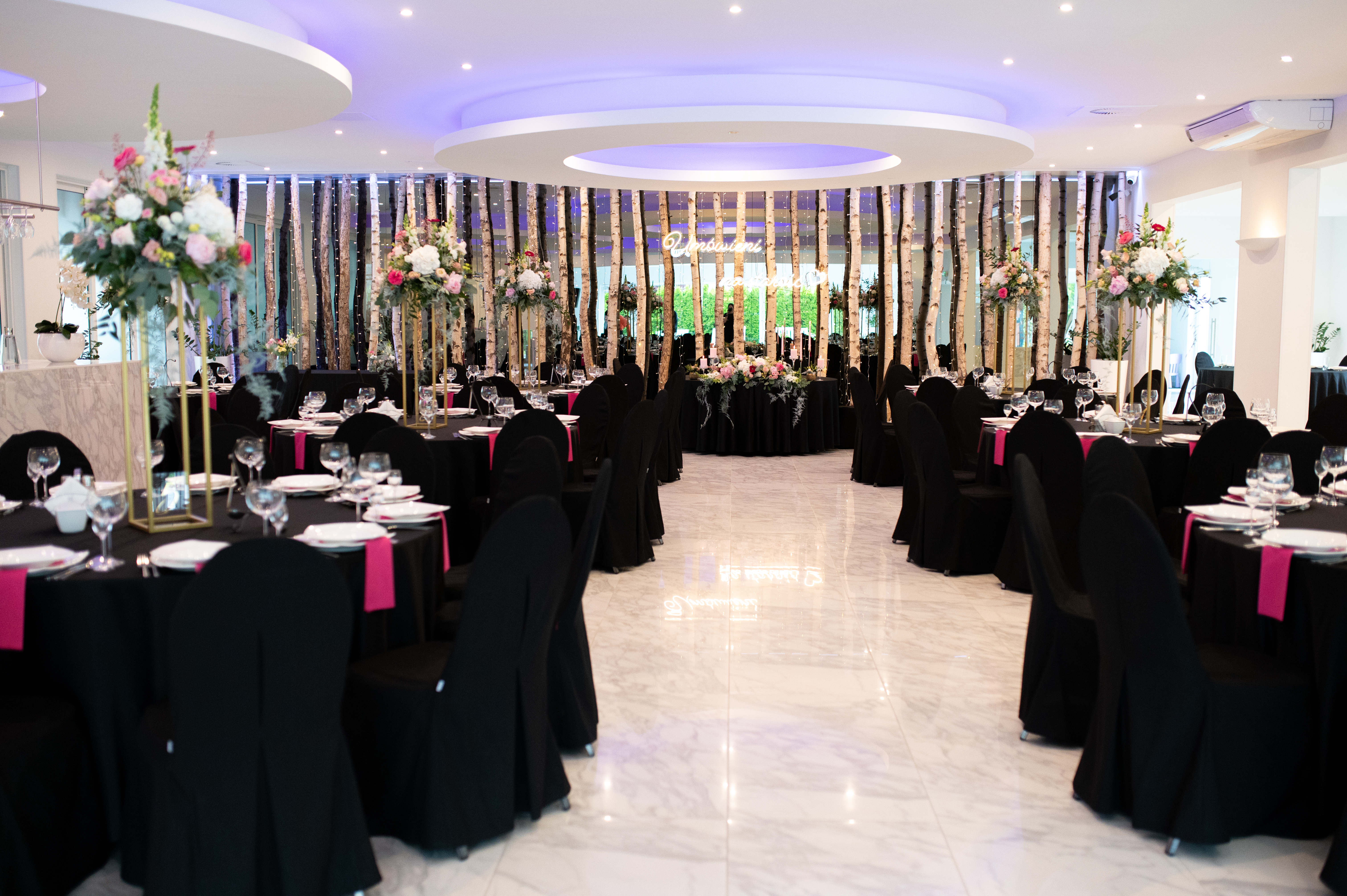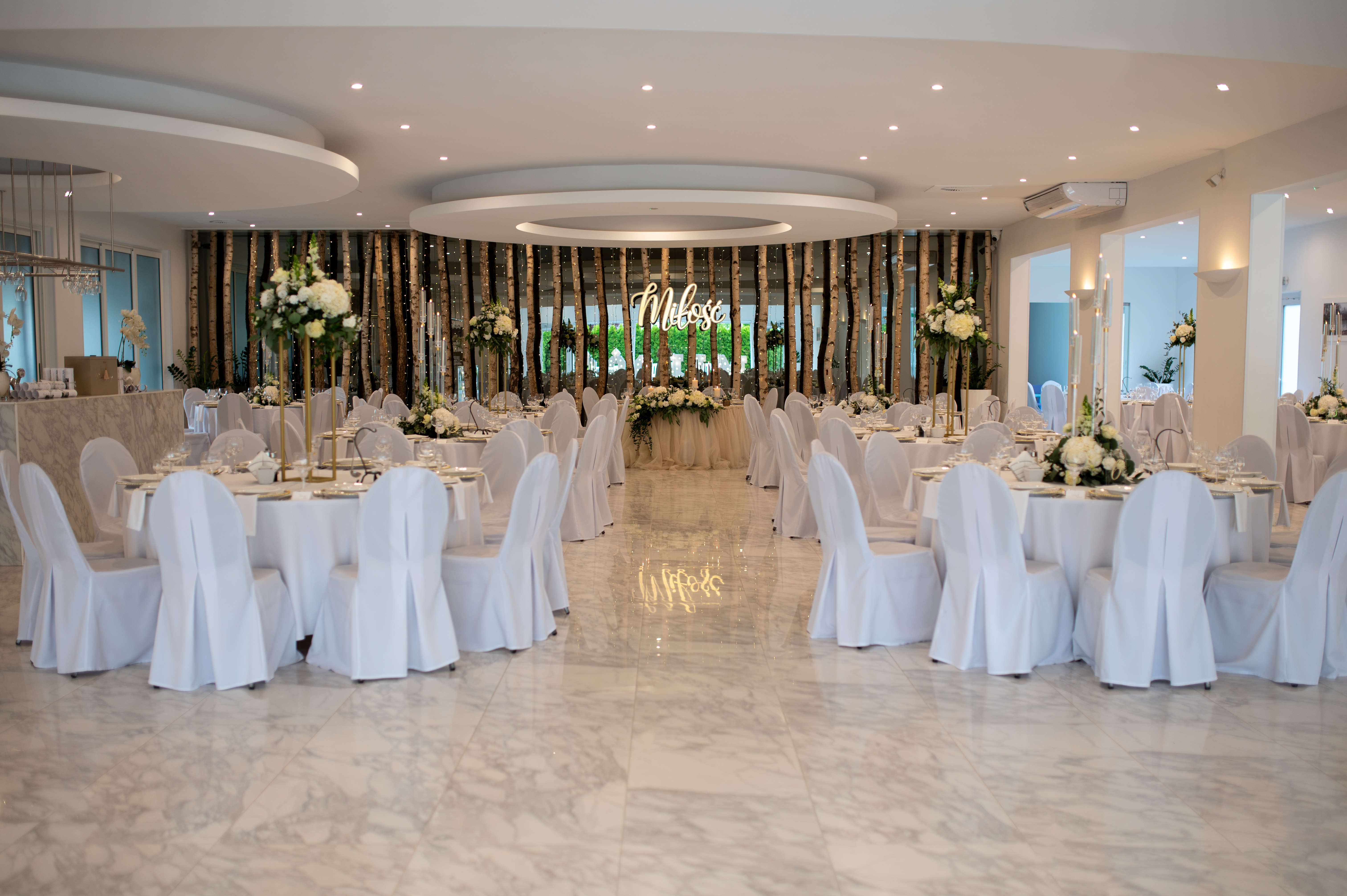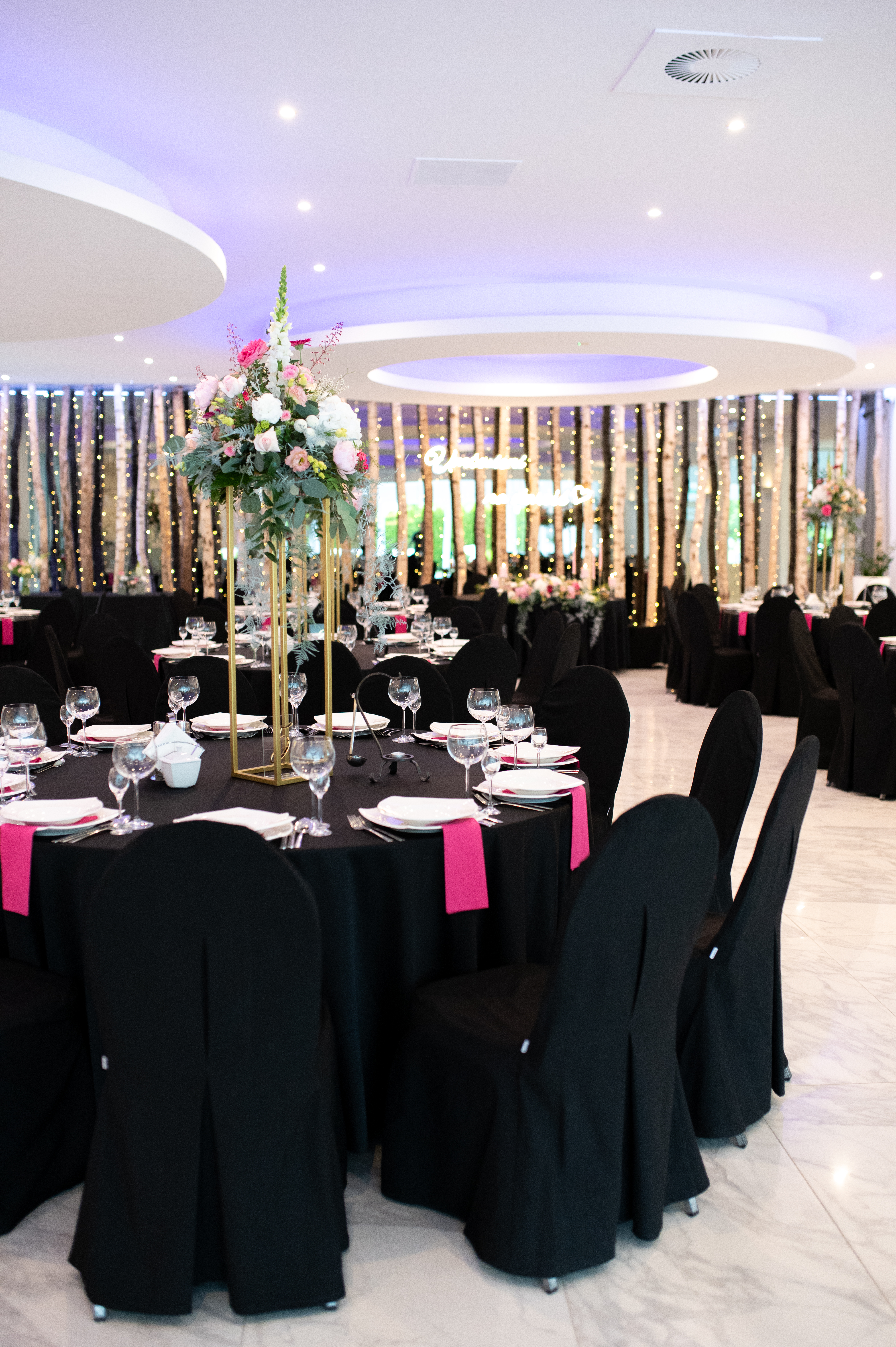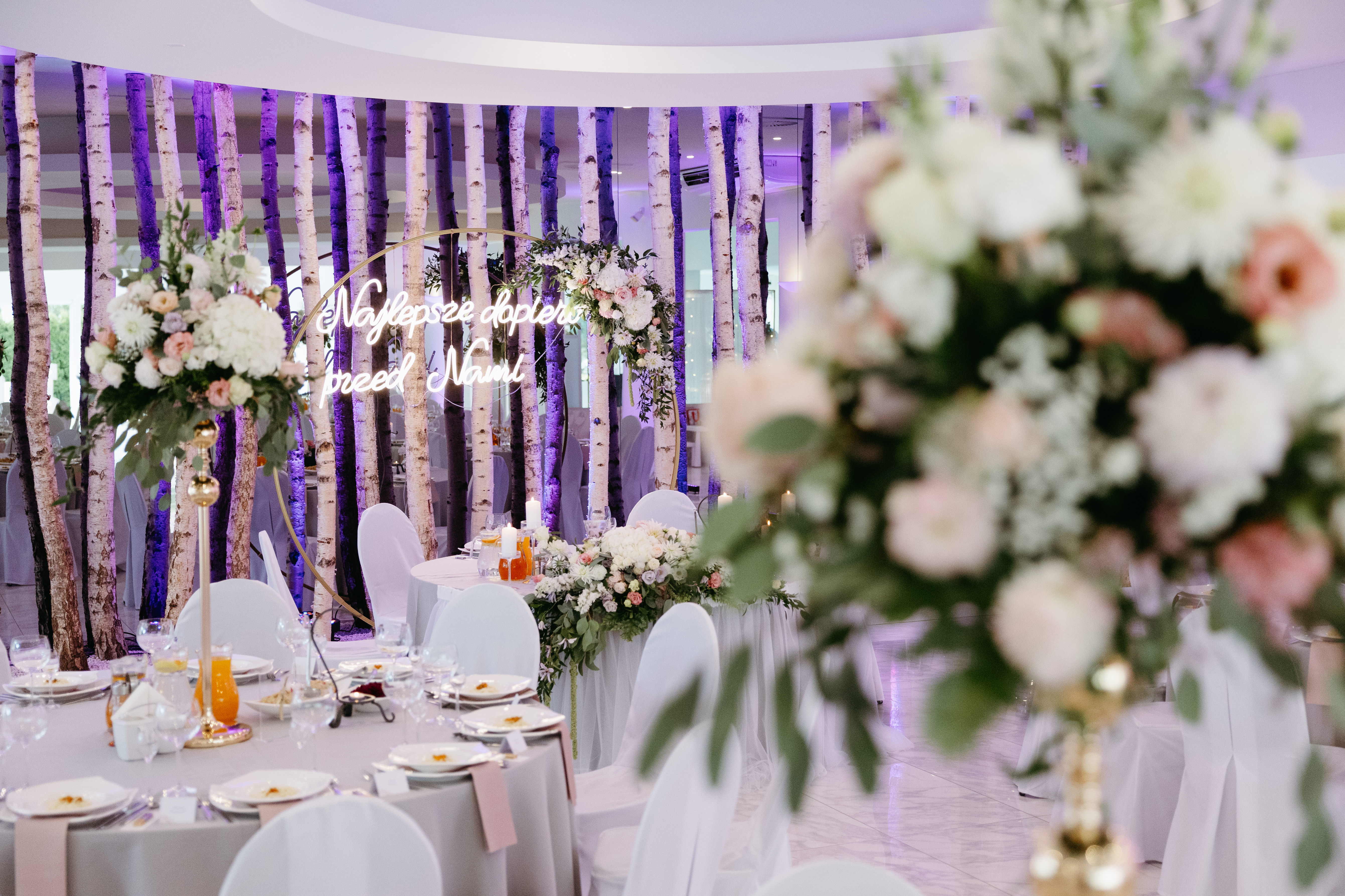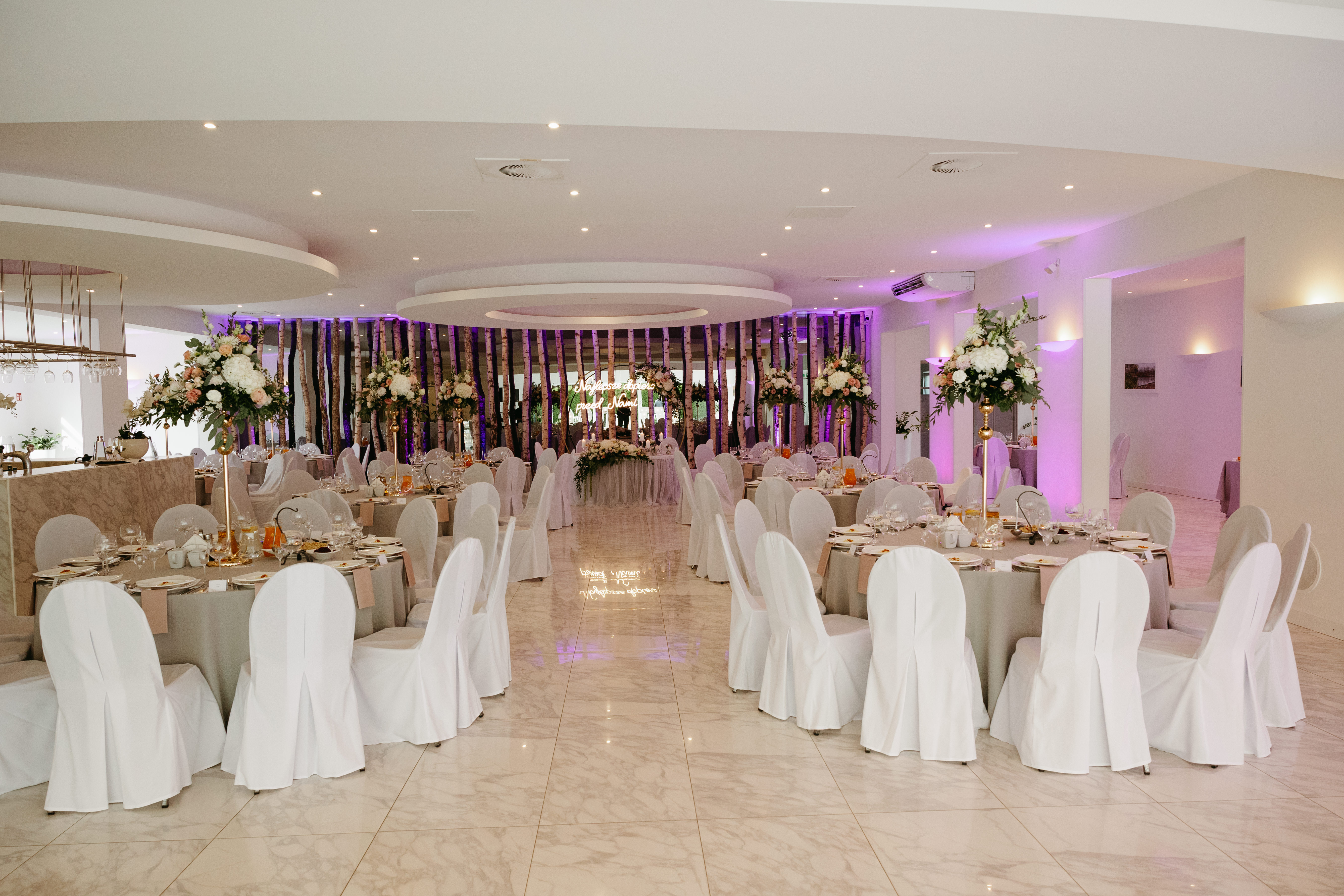 Marmurowa podłoga, okrągłe sufity z podświetleniem i imponująca ściana z brzozowych pni tworzą wnętrze, które robi wrażenie już od pierwszego spojrzenia. Wnętrze można aranżować w różnych stylach – od klasycznego i romantycznego po nowoczesny i tematyczny. Sala zachwyca zarówno w dekoracjach ślubnych, jak i wieczornych stylizacjach na 18-stki czy gale.