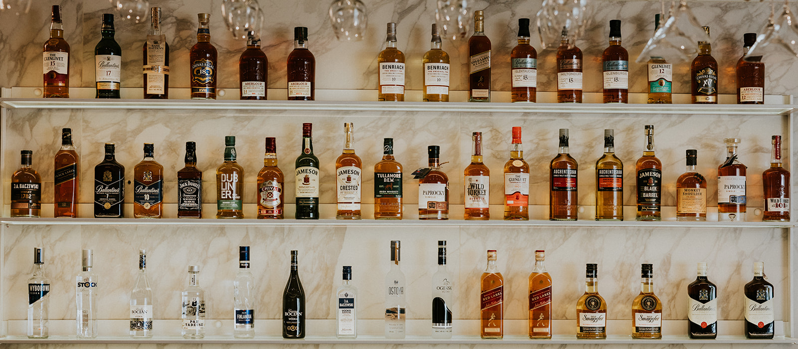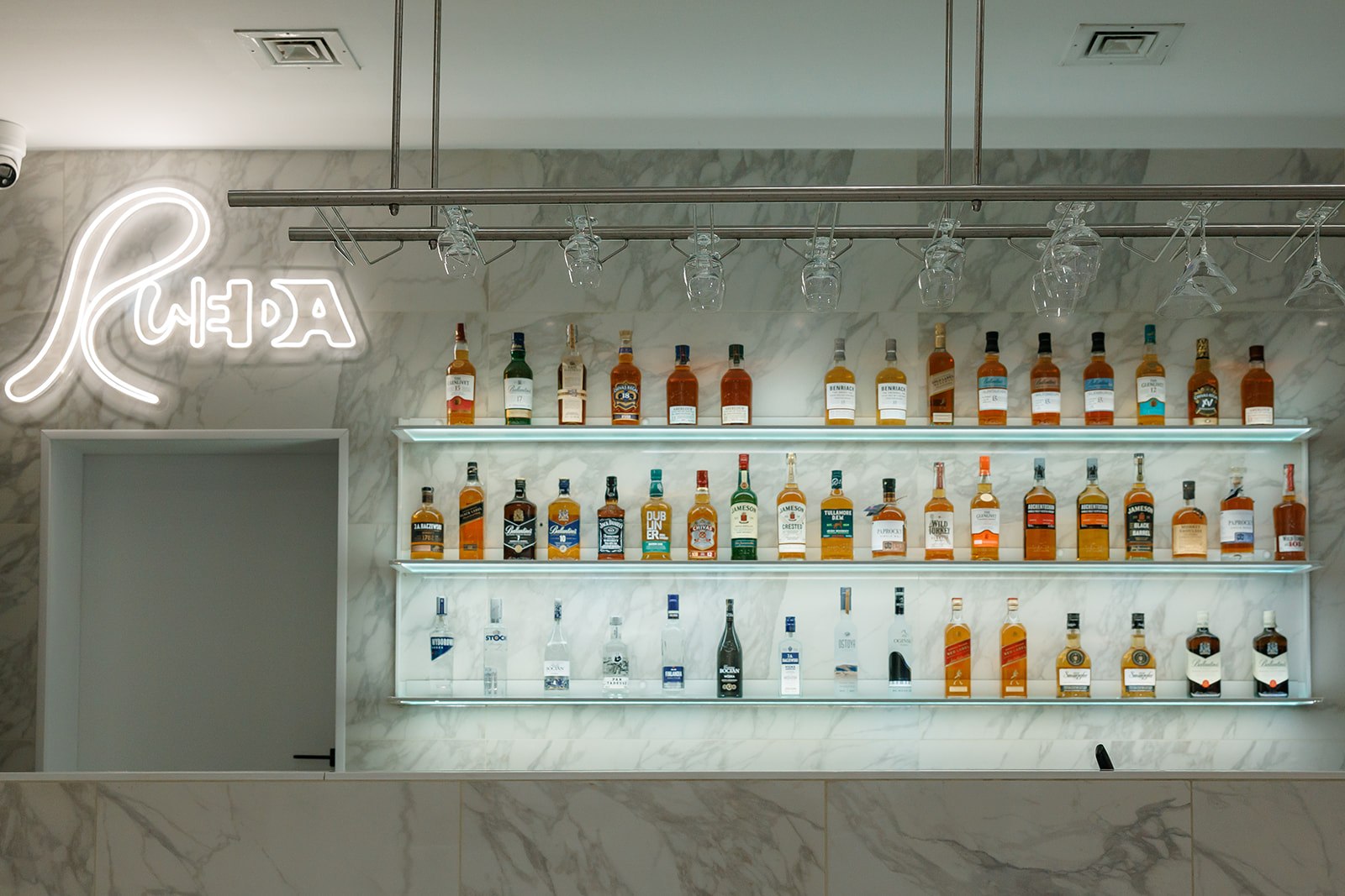 Integralną częścią sali jest stylowy, marmurowy bar z podwieszanym systemem kieliszkowym i podświetlaną ekspozycją alkoholi. To centralne miejsce wieczornej atmosfery i elegancki punkt kontaktu gości z obsługą.