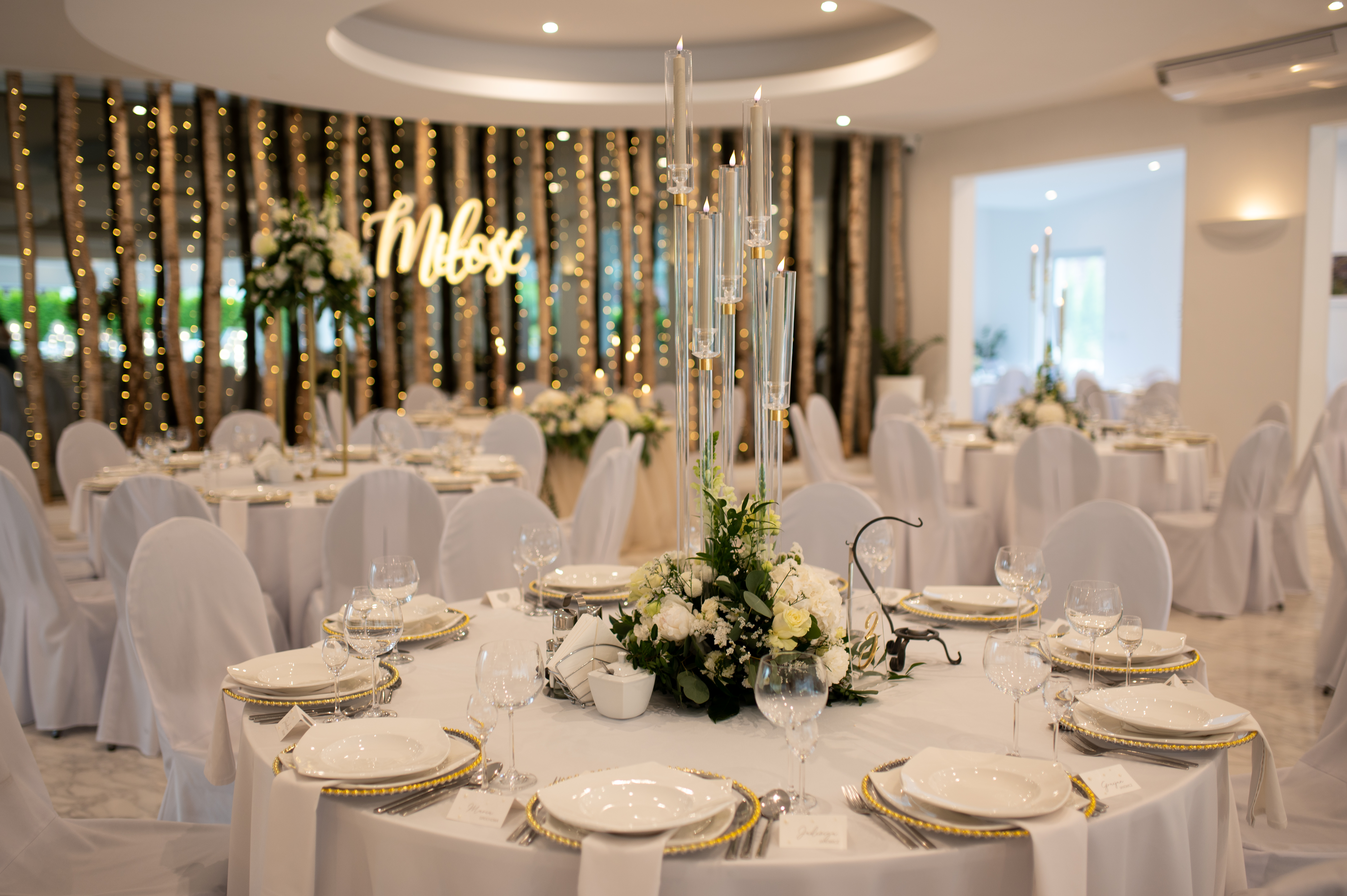 Sala Biała to największa i najbardziej reprezentacyjna przestrzeń w kompleksie Rueda. Jasna, elegancka i w pełni nowoczesna – została stworzona z myślą o organizacji wyjątkowych wydarzeń: wesel, komunii, jubileuszy, przyjęć okolicznościowych oraz firmowych gal.