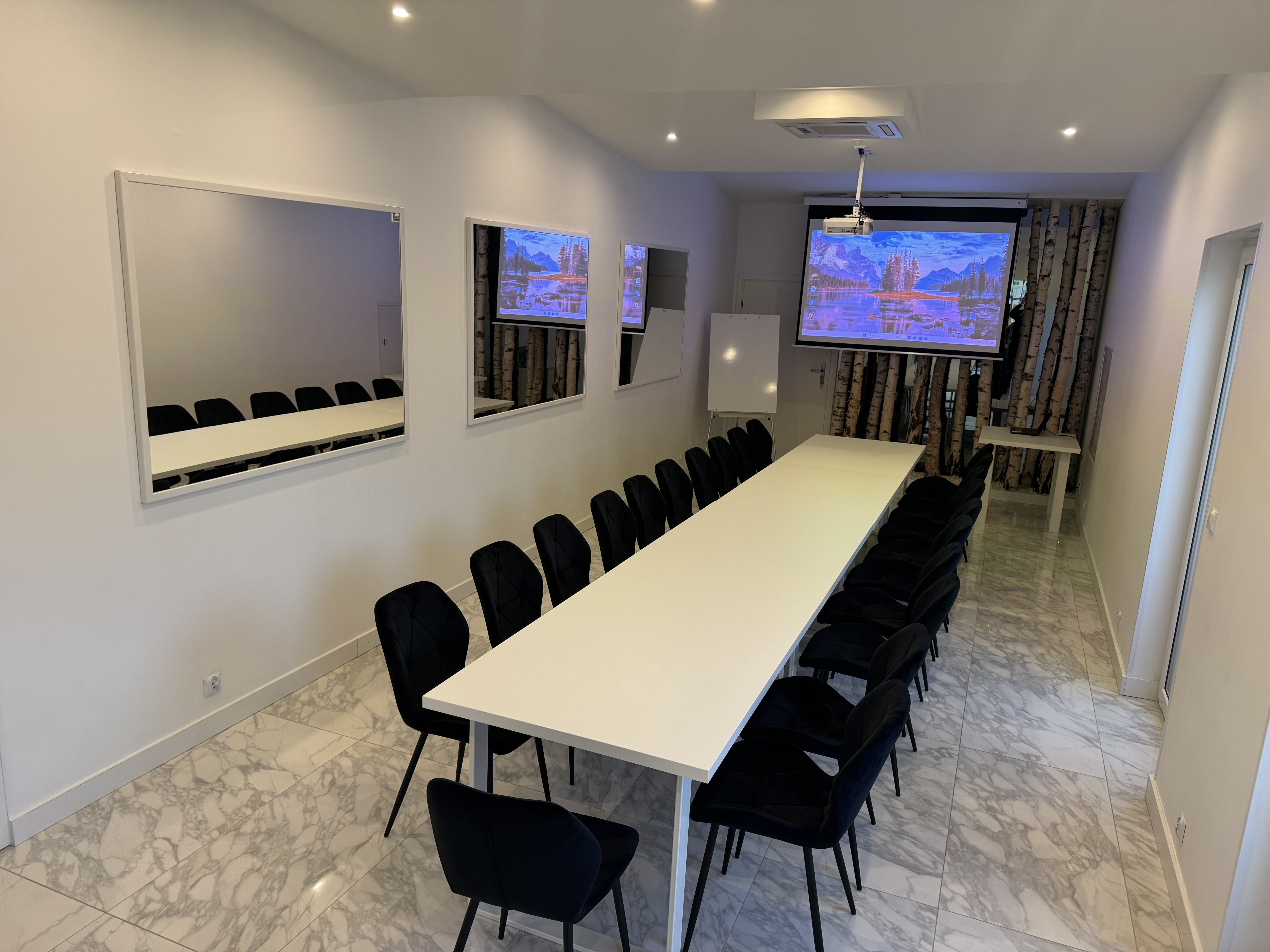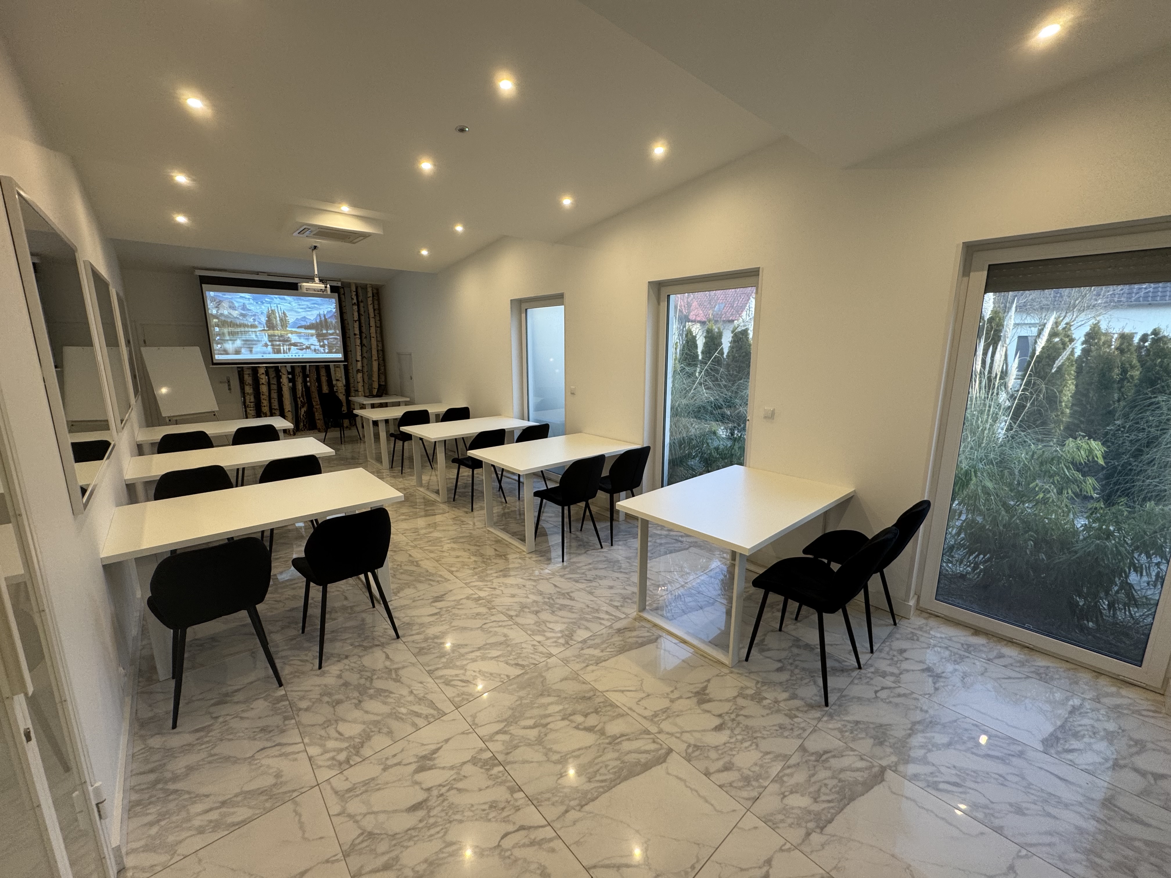 Komfortowa sala o powierzchni 45 m², przeznaczona dla grup do 25 osób. Sprawdza się podczas warsztatów, prezentacji i szkoleń w mniejszym gronie. Wyposażenie obejmuje projektor z ekranem, flipchart, klimatyzację, ściemniane oświetlenie oraz możliwość pełnego zaciemnienia. Dostępne jest również Wi-Fi.