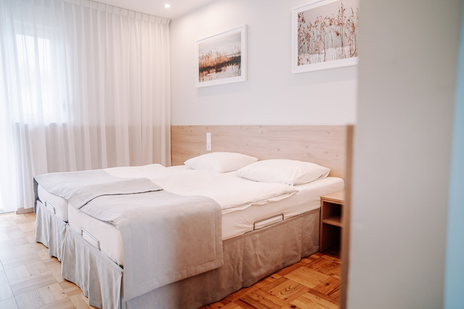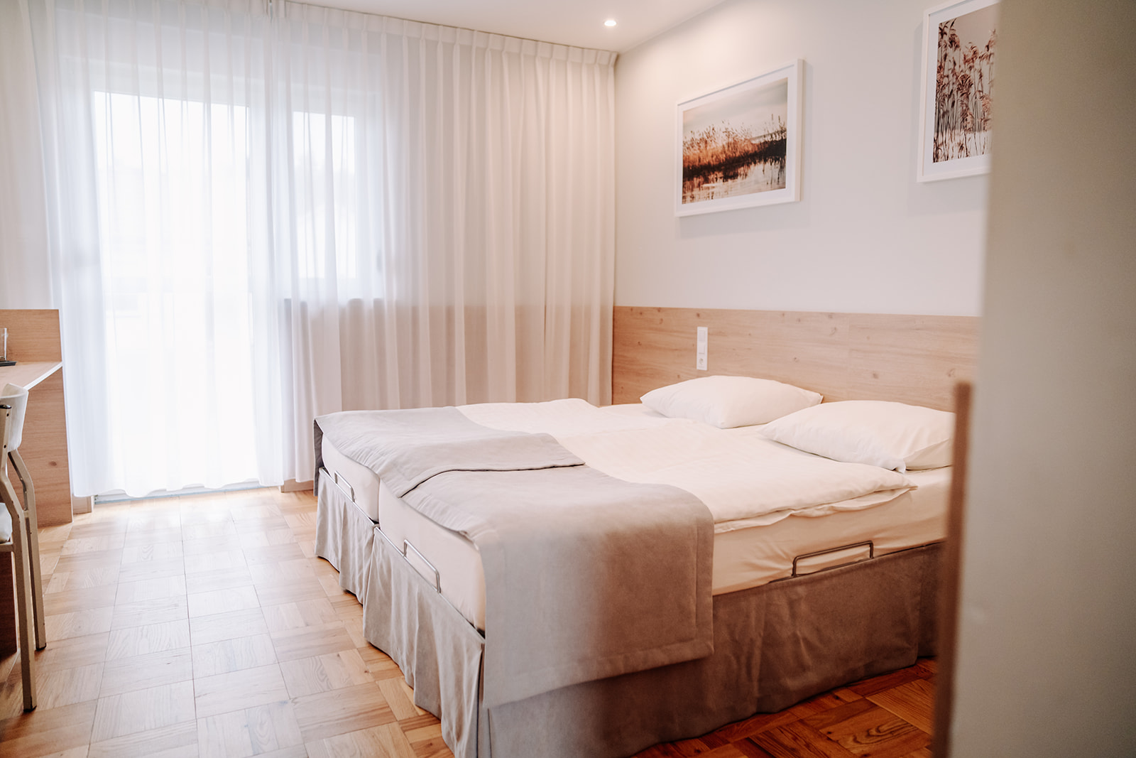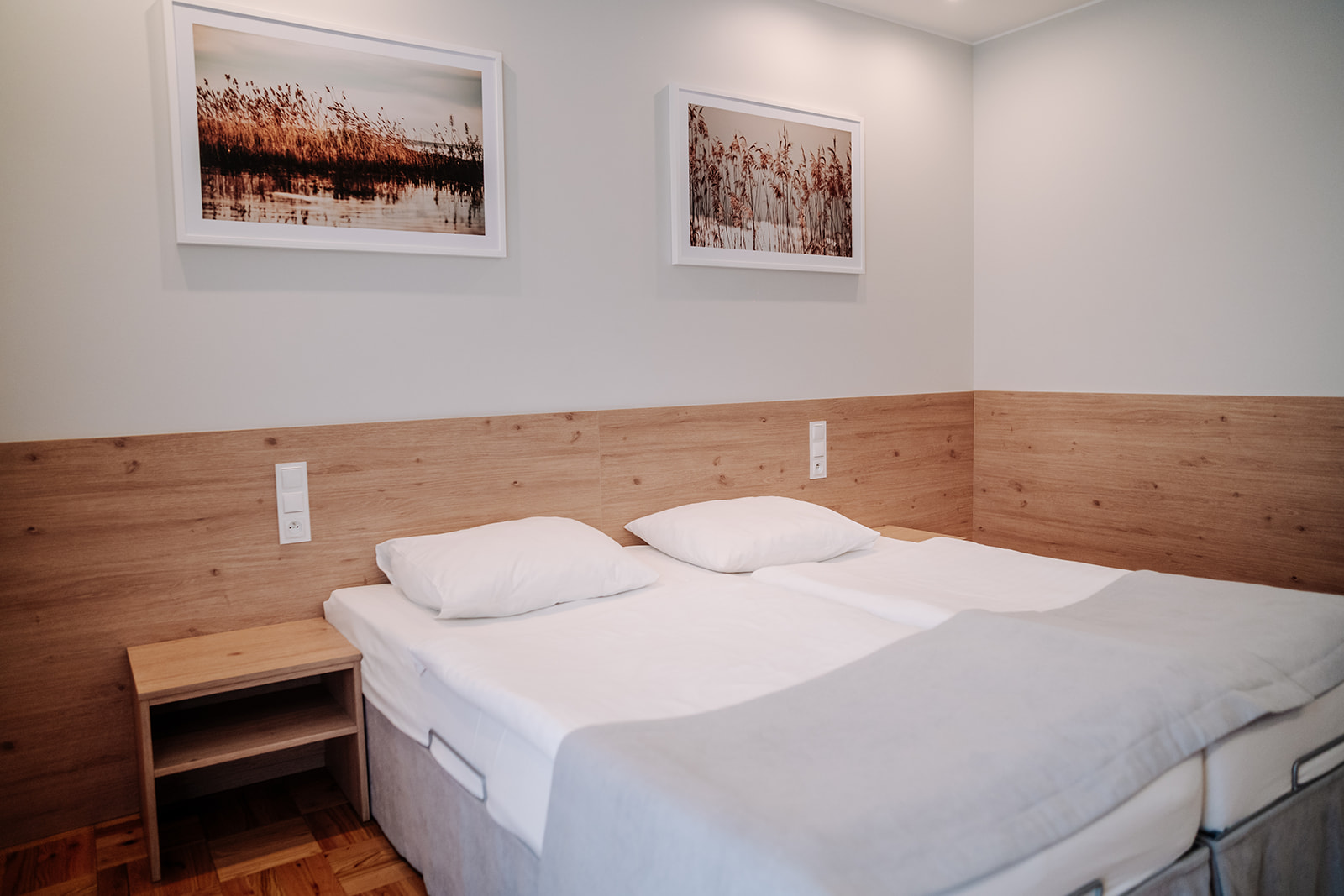 - Pokoje rodzinne 2×2 – ok. 32 m²: dwa pokoje 2-osobowe + wspólny korytarz i łazienka.