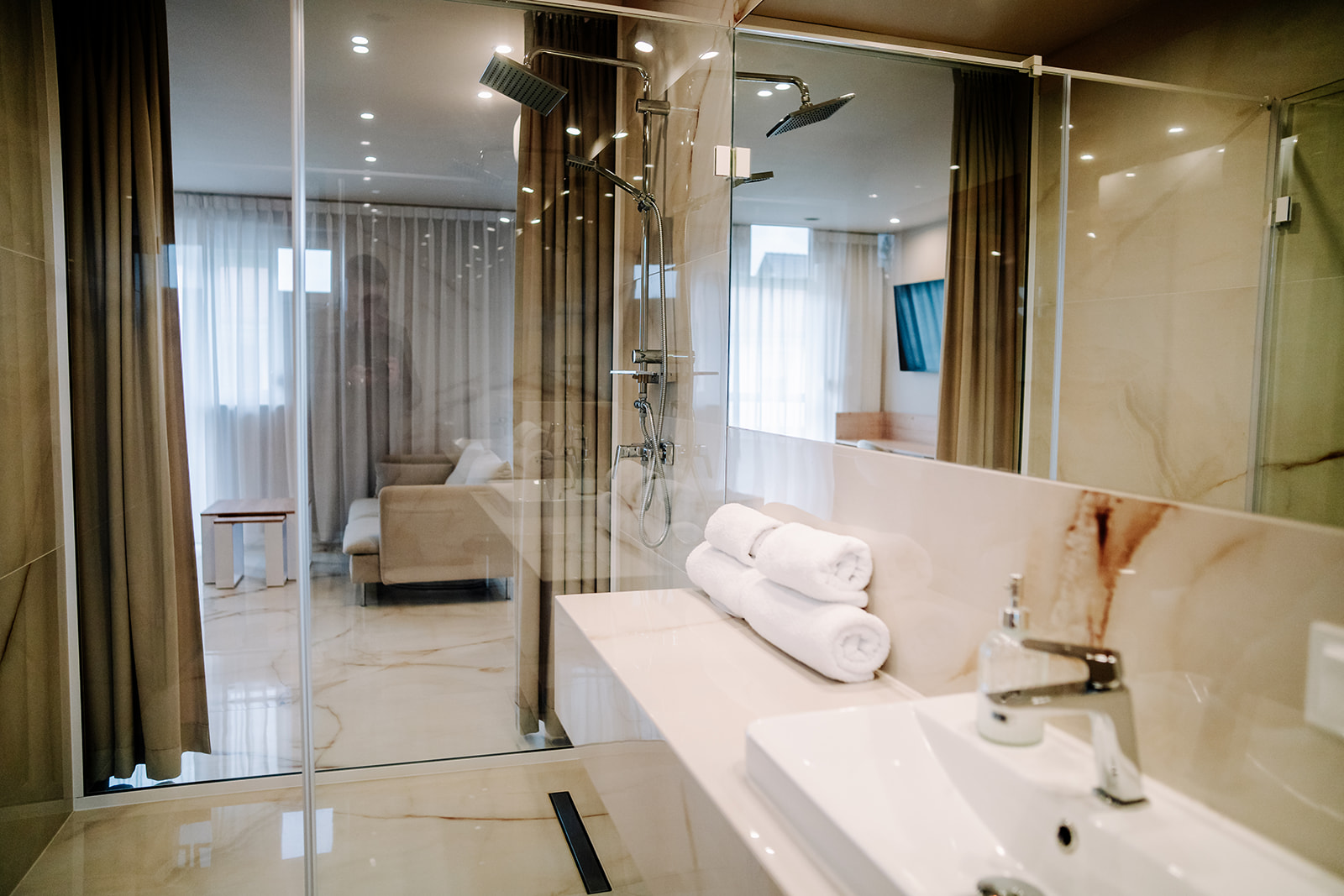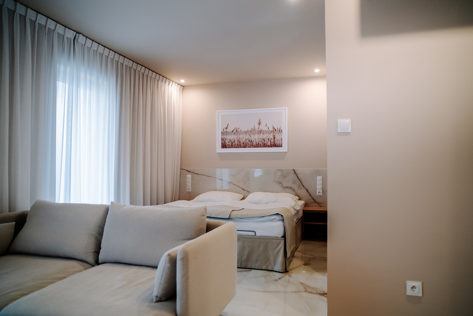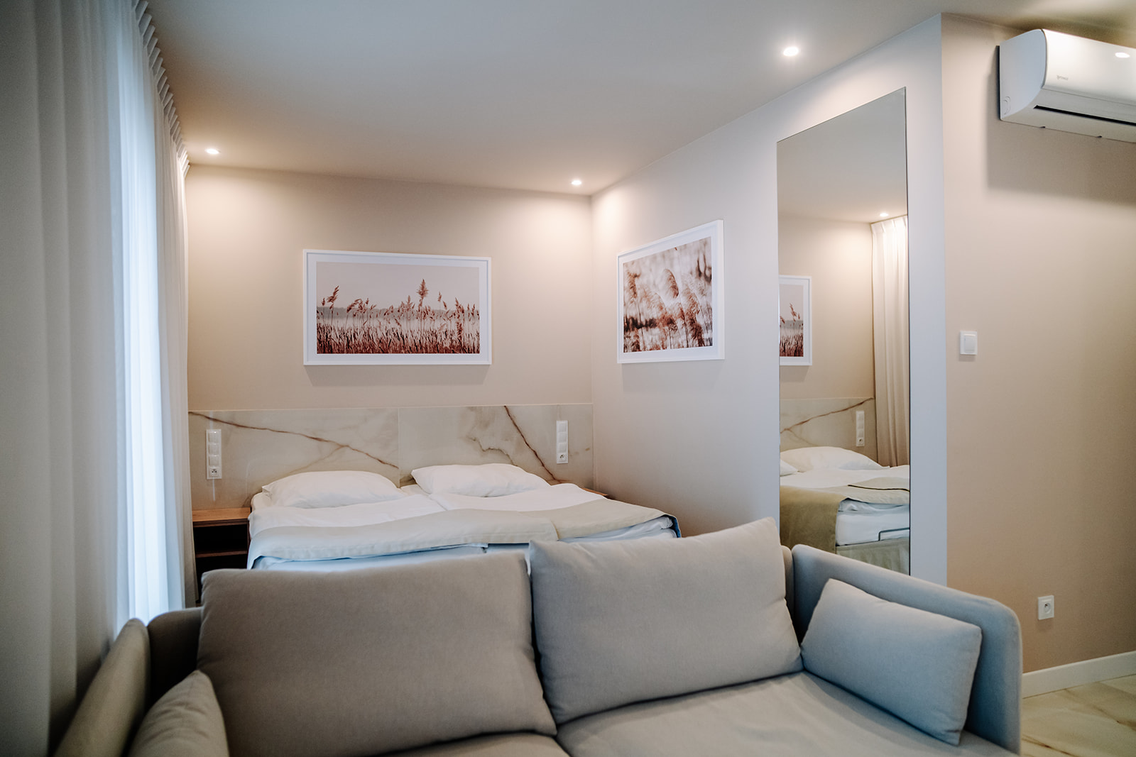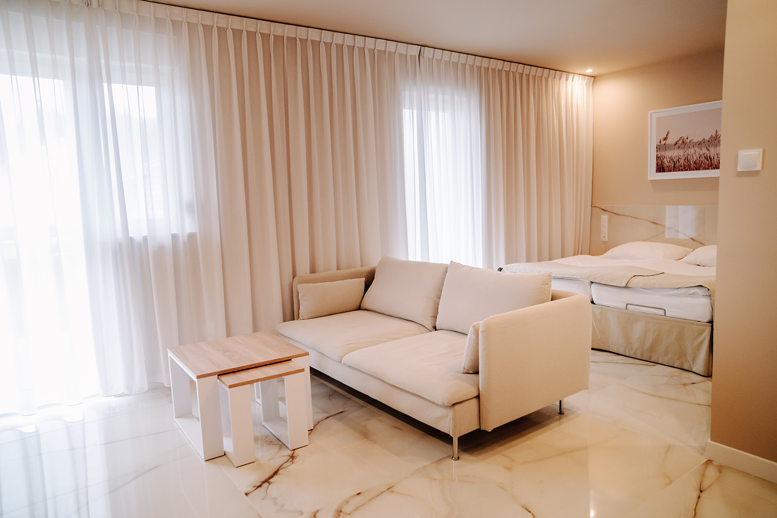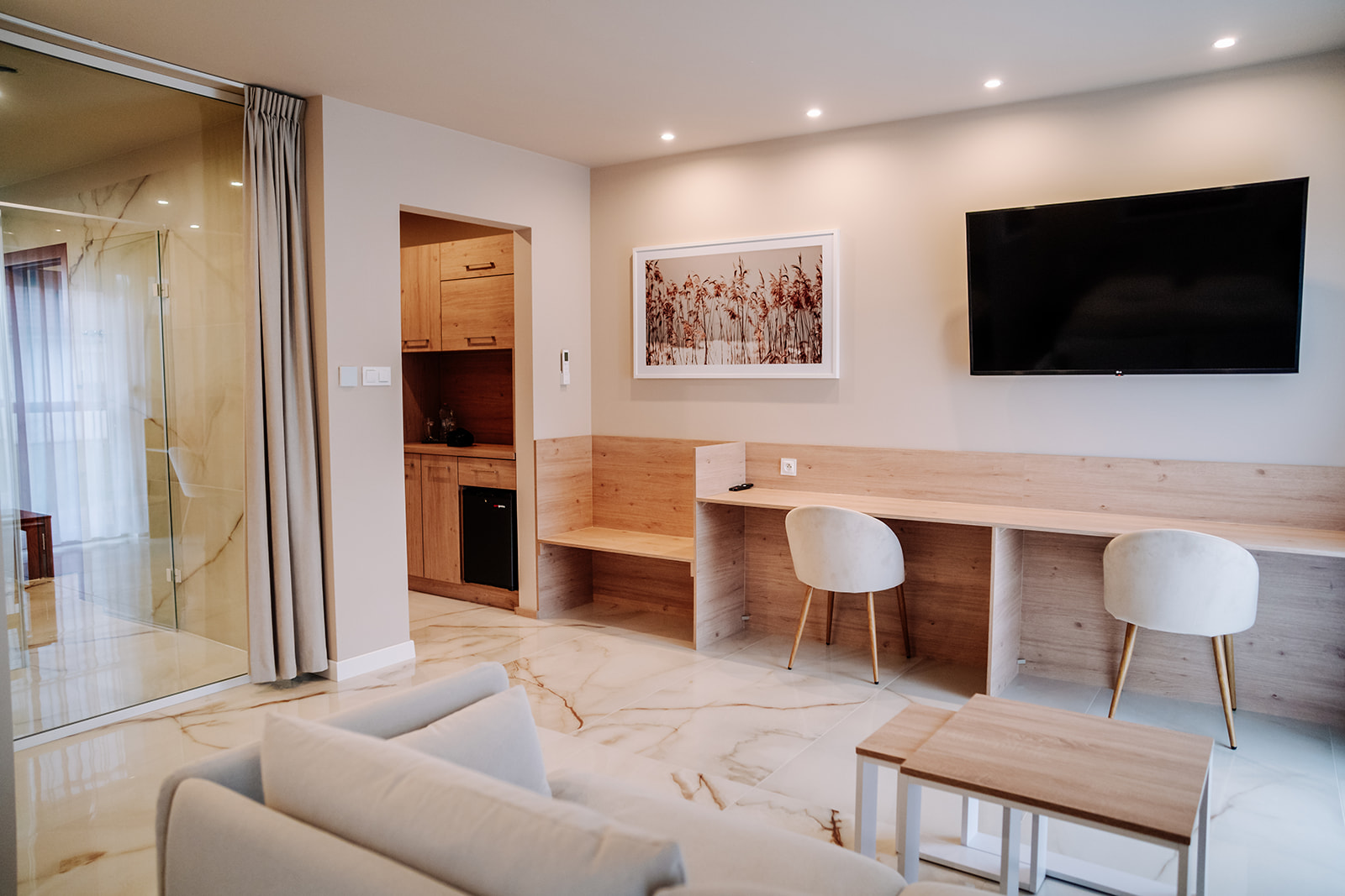 - Pokój typu studio – ok. 35 m², osobna sypialnia, część dzienna i aneks kuchenny.